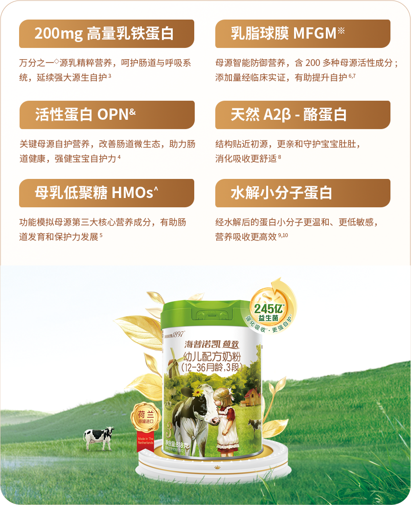 9. 指营养素的实证描述,不代表产品功效:97%消化率:指蛋白质消化率,依据体外消化模拟实验及结果《强化OPO、LTF和CPP对婴配粉蛋白和脂肪消化特性的影响》;肚肚舒适:HMOs促进有益菌生长,增强肠道防护,Carr, Laura E et al. Frontiers in immunology vol. 12 604080. 12 Feb. 2021;体质棒:乳铁蛋白具有多重健康防护作用,乳铁蛋白婴幼儿健康效应专家共识[J]. 临床儿科杂志, 2018, 36 (11): 884-888;少敏感:水解乳清蛋白粉原料经预消化,有助降低牛奶整蛋白致敏性;便便轻松:益生菌、益生元组合有助于婴幼儿便便轻松。Vlieger AM, et al. Br J Nutr. 2009;102(6):869-75; Moro, et al. J Pediatr Gastroenterol Nutr, 2002;脑眼发育:DHA对婴儿脑发育和视网膜发育至关重要,中国孕产妇及婴幼儿补充 DHA 的专家共识[J]中国生育健康杂志, 2015(2):99-101;吃饭香:CPP有助于提高锌的吸收,锌有助改善食欲,刘成龙, et al. 现代食品29.23(2023):29-32., 2018., GB28050;夜间安睡:OPO有助减少哭闹,帮助夜间安睡,Ghide MK, et al. J Food Biochem. 2021 Jul;45(7):e13799;骨骼强健:CPP有助于提高钙的吸收,钙有助骨骼健康,刘成龙,et al. 现代食品 29.23(2023):29-32.,2018.