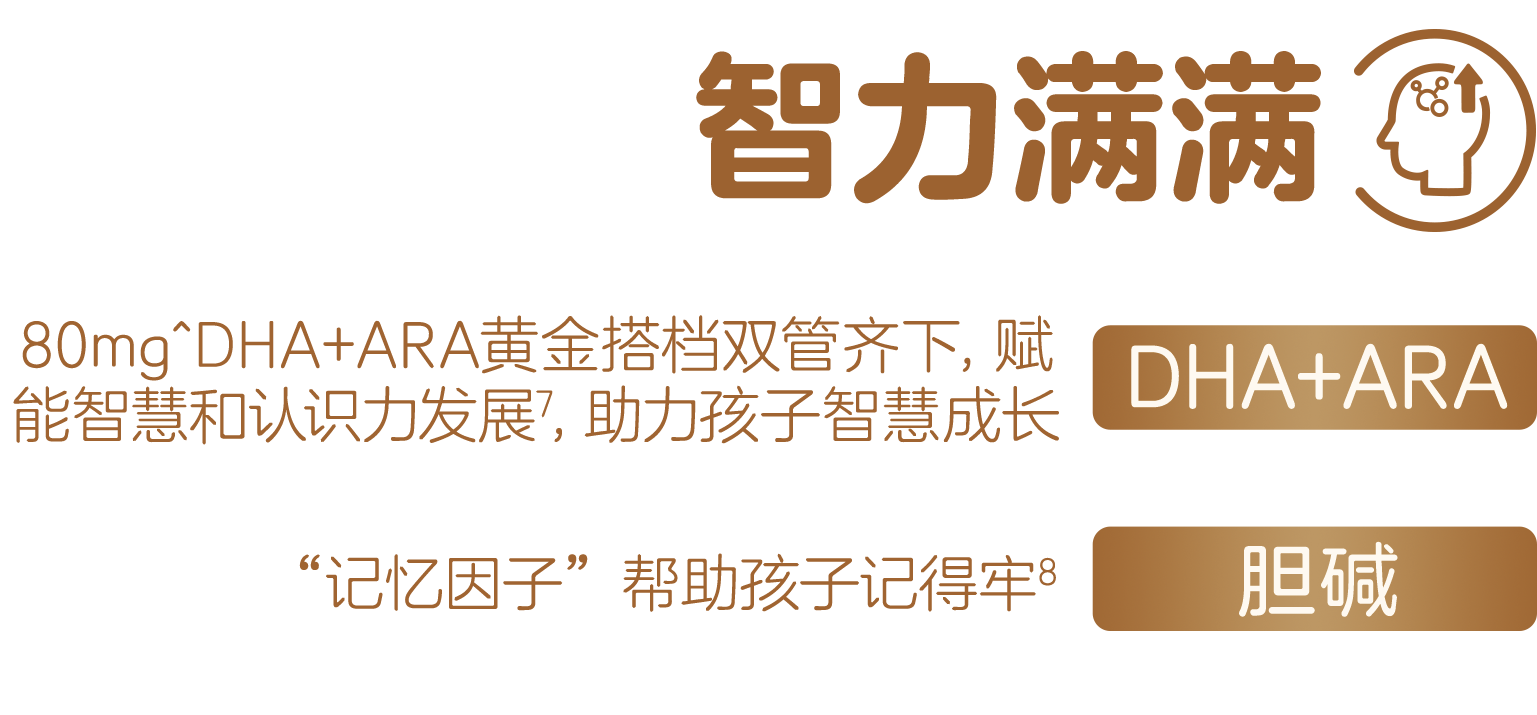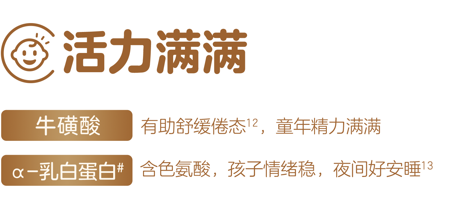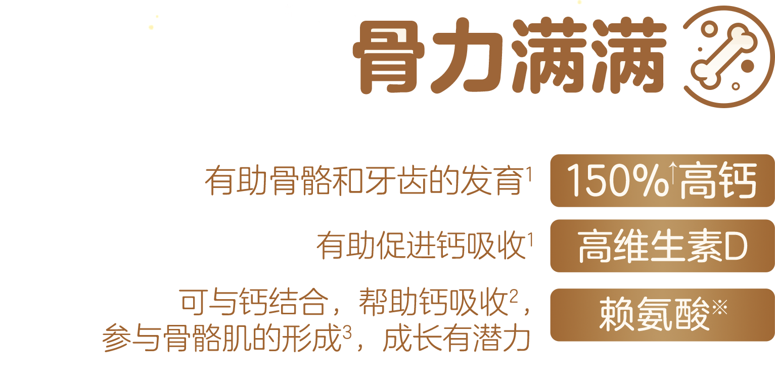 *满格比喻孩子在成长过程中包括骨骼力、自护力、智慧力、视力、吸收力以及活力在内的多个维度。↑本品钙含量为1100mg/100g,与儿童配方奶粉(代表值)钙含量为705mg/100g相比。
